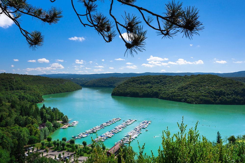 Découvrez le lac de Vouglans, une étendue d'eau turquoise entourée de forêts, parfaite pour la baignade et les activités nautiques.