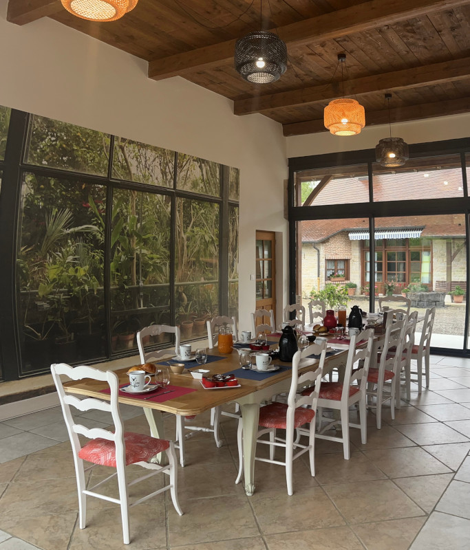 Chaque matin, un copieux petit-déjeuner continental vous sera servi, inclus dans votre réservation, sur la terrasse ombragée ou dans la salle à manger avec de grandes baies vitrées pour profiter de la nature environnante.